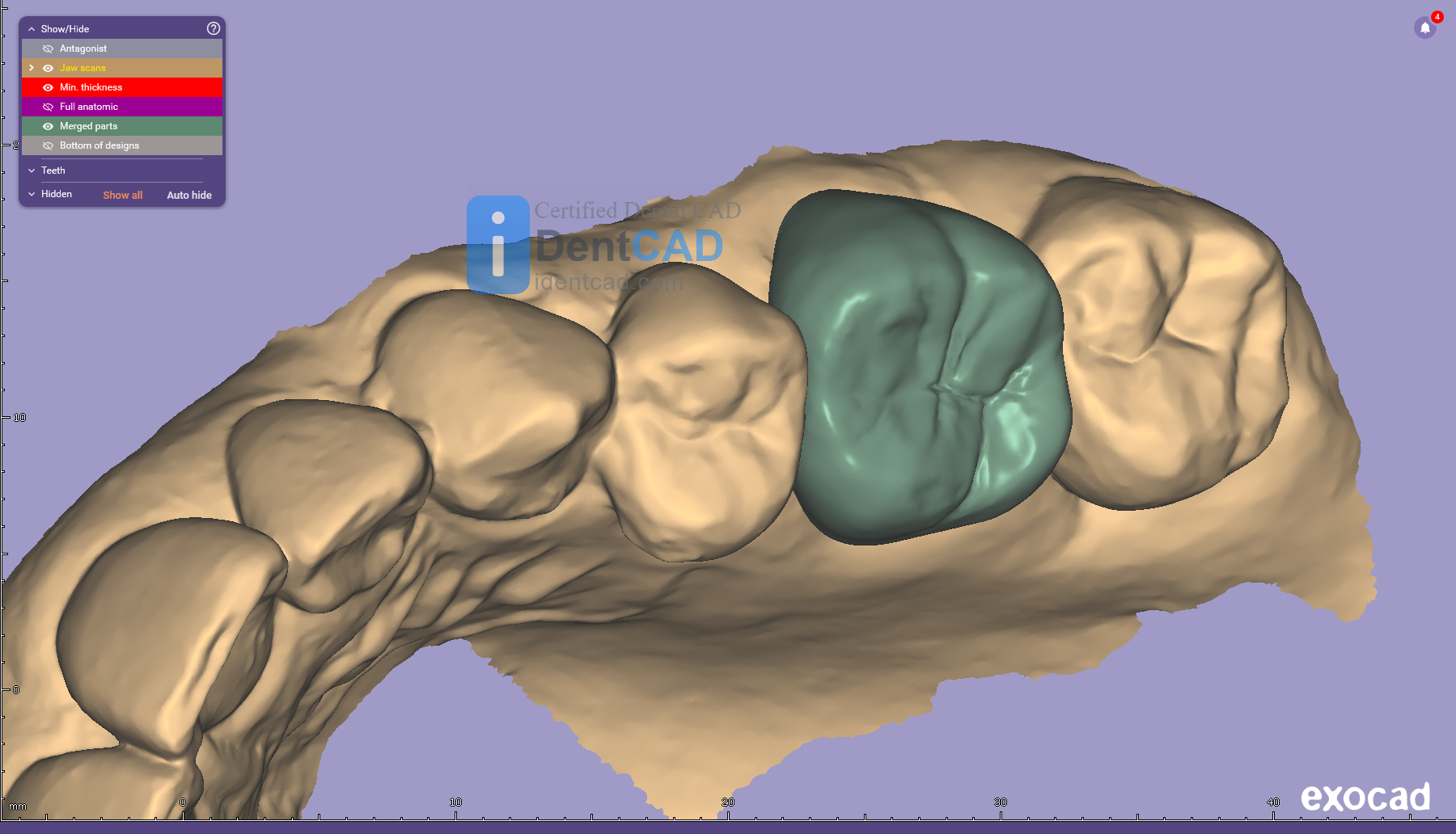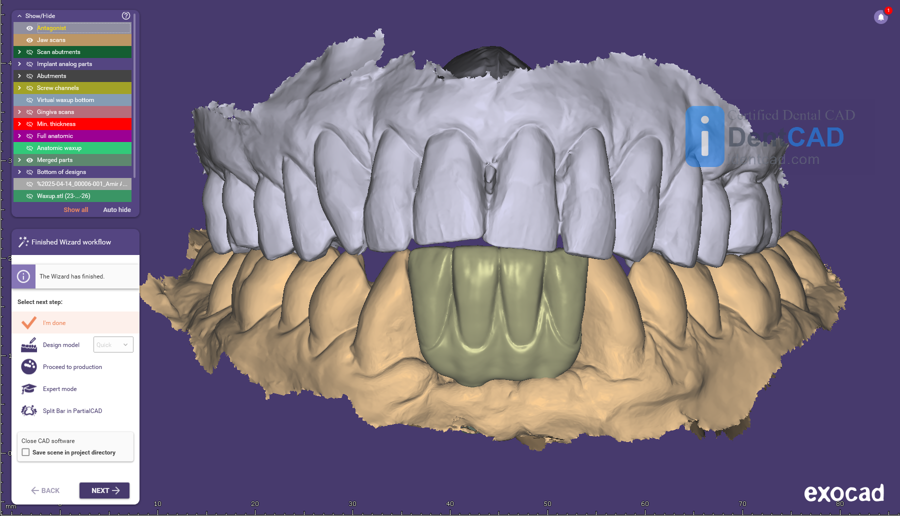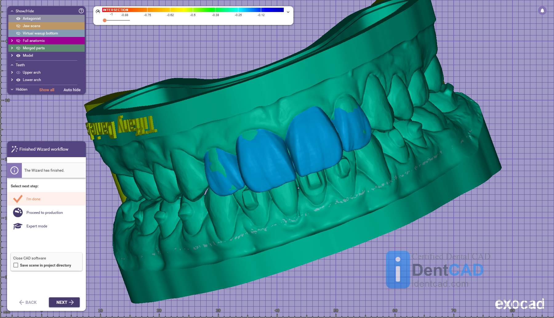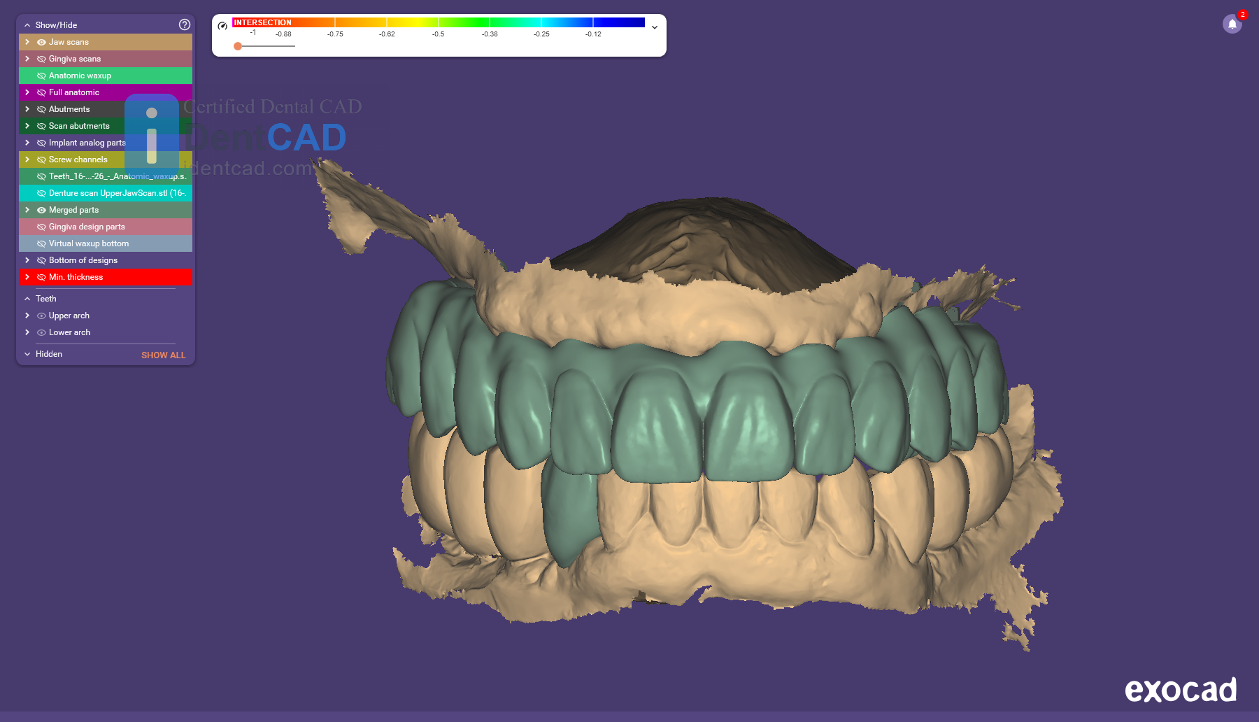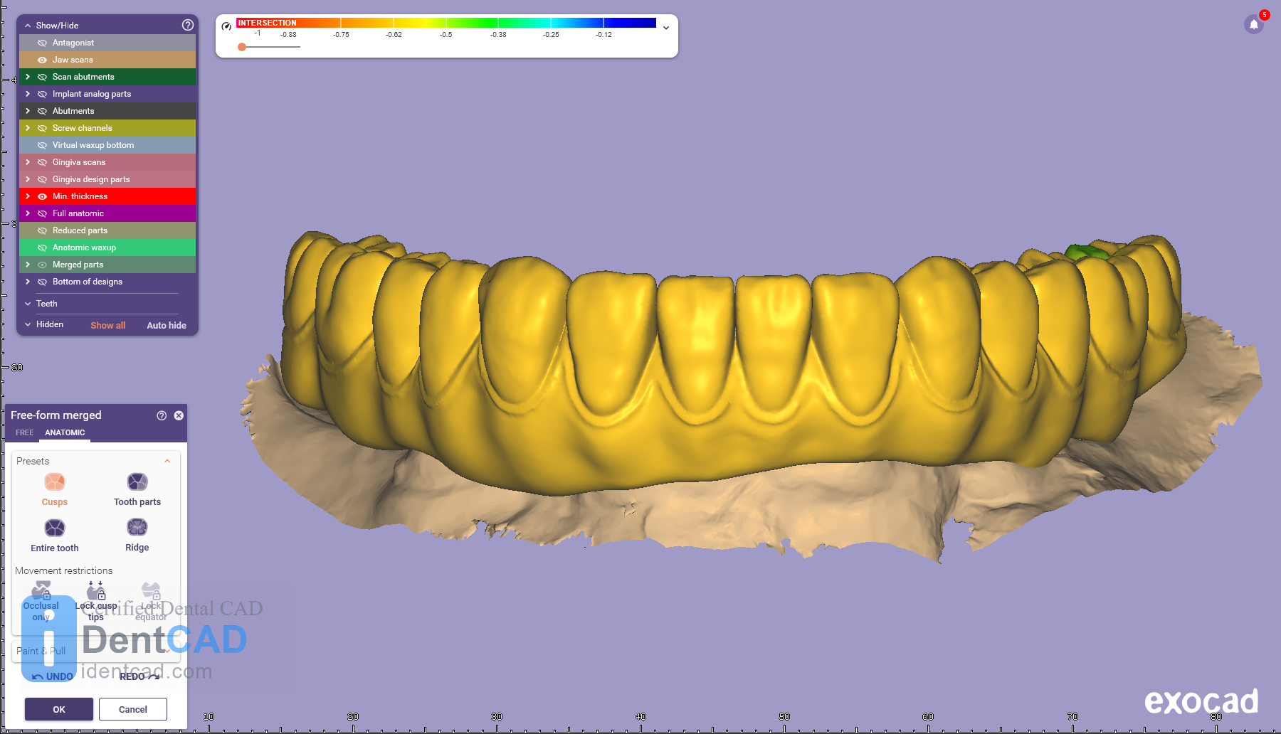 Our primary workflow is built on Exocad (DentalCAD) for restorative, implant, and smile design cases. We also use 3Shape for cross-verification and articulation checks.