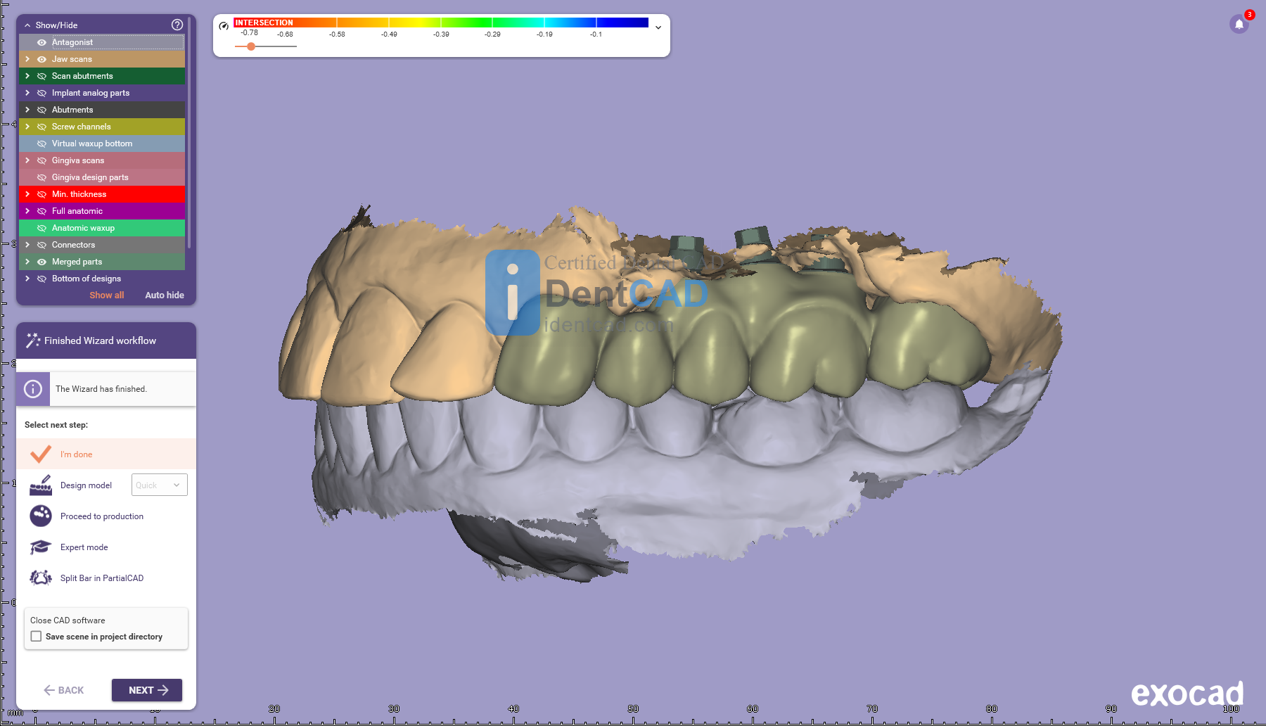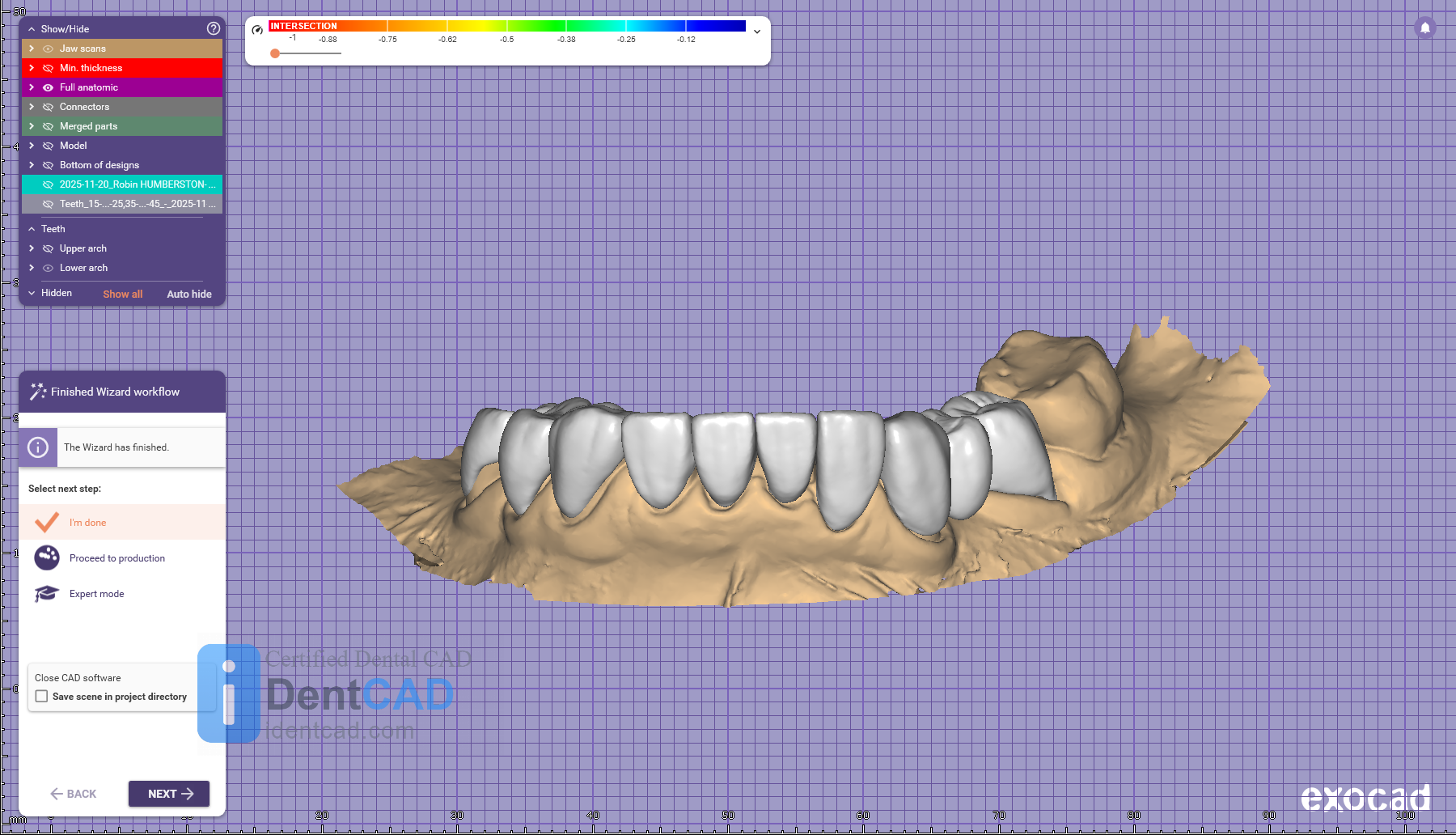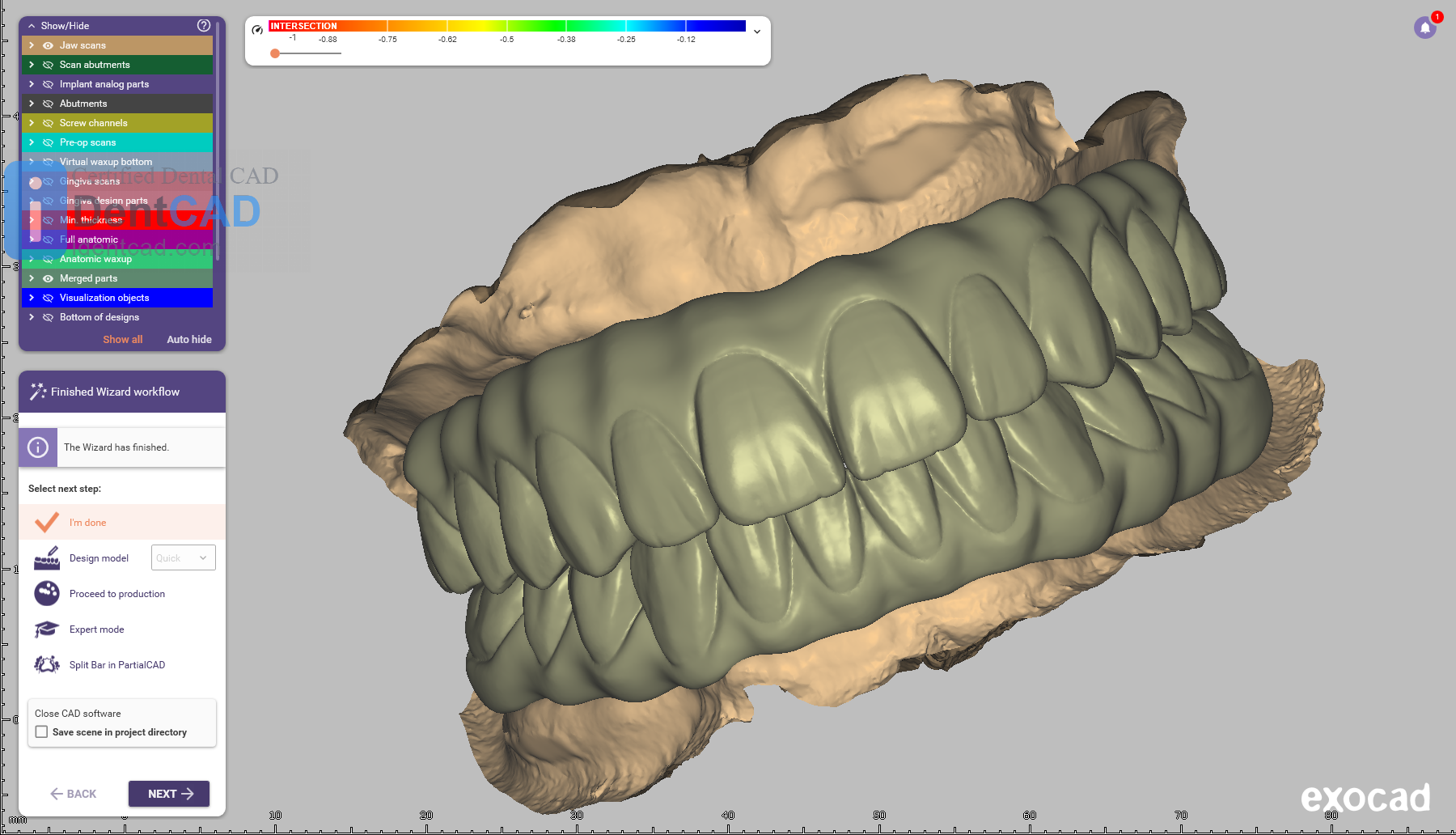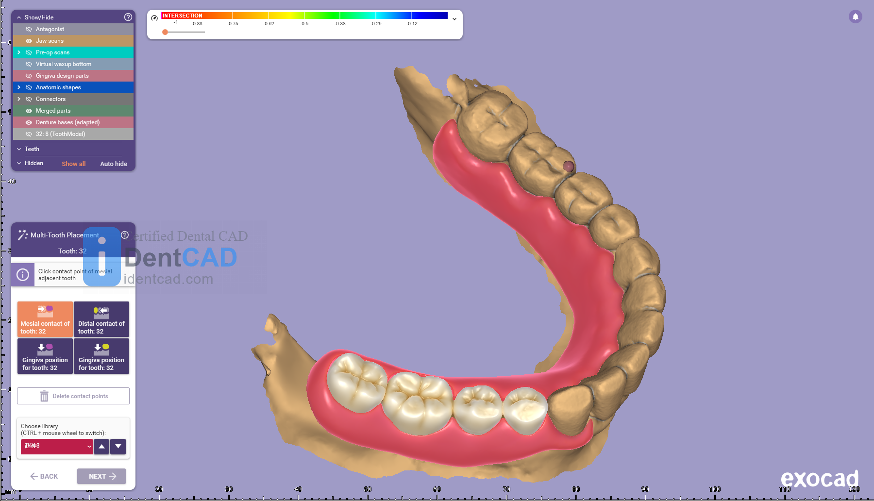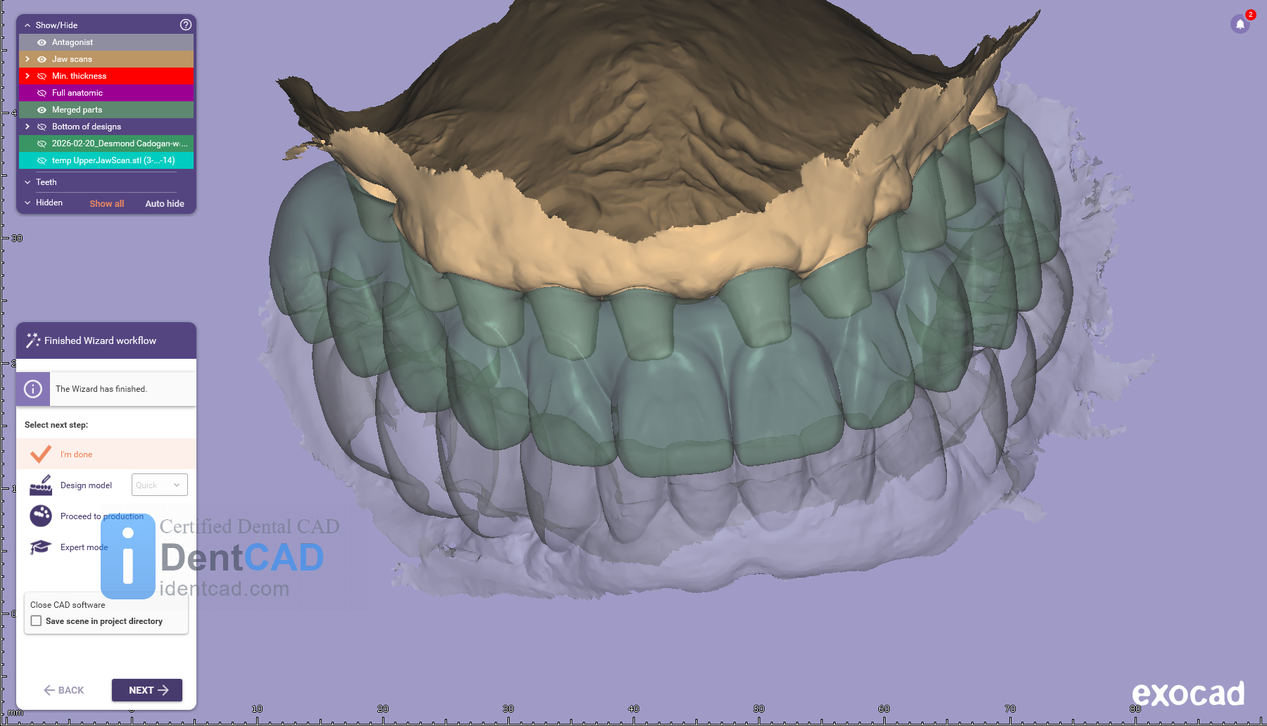 Our primary workflow is built on Exocad (DentalCAD) for restorative, implant, and smile design cases. We also use 3Shape for cross-verification and articulation checks.