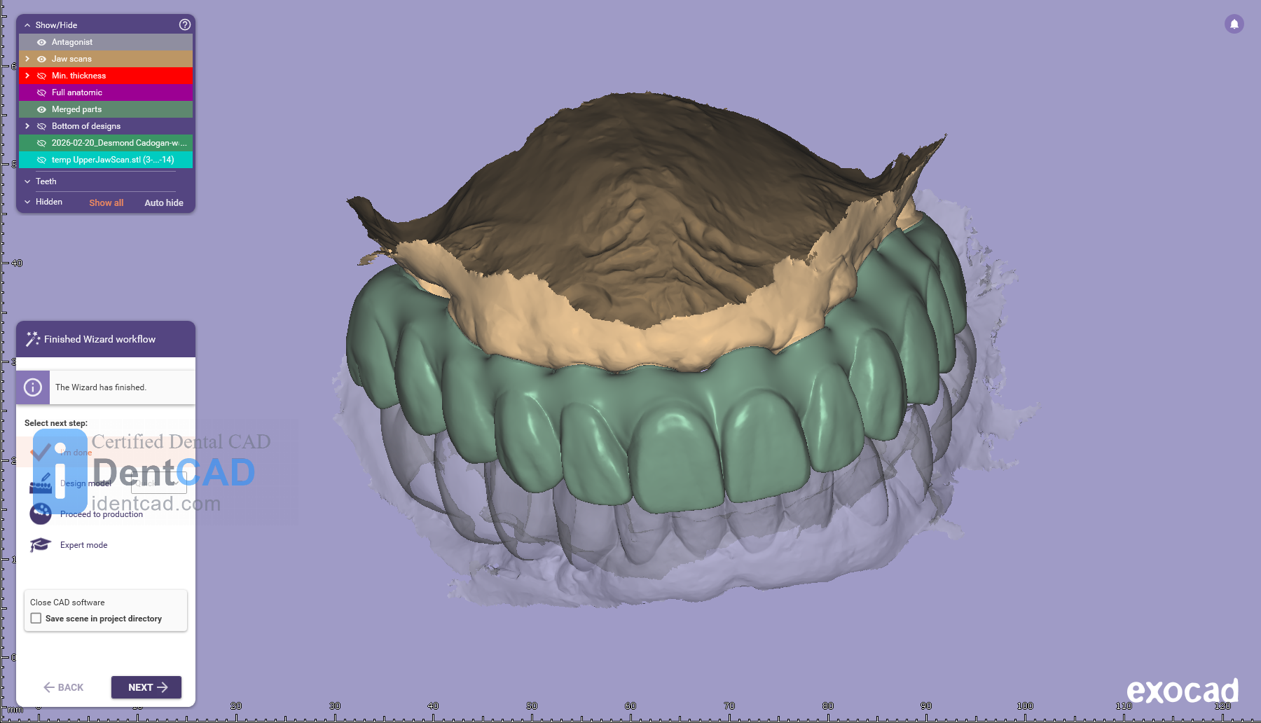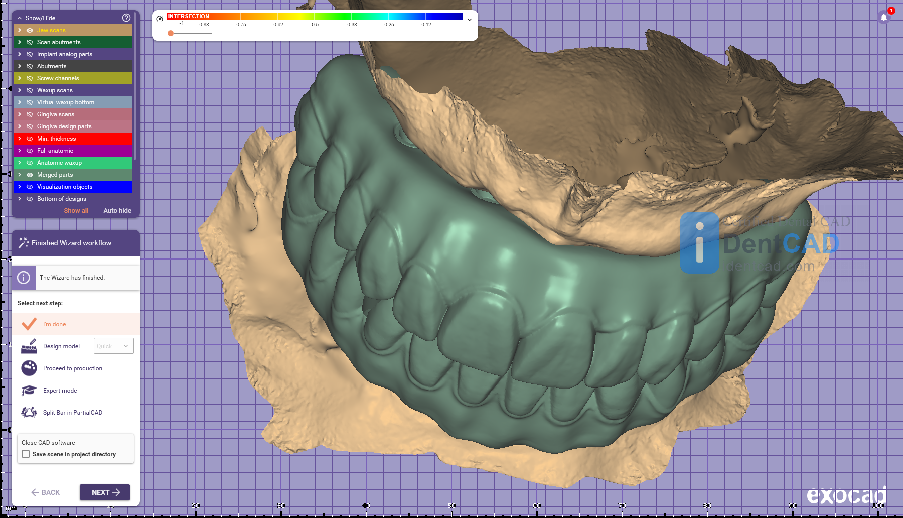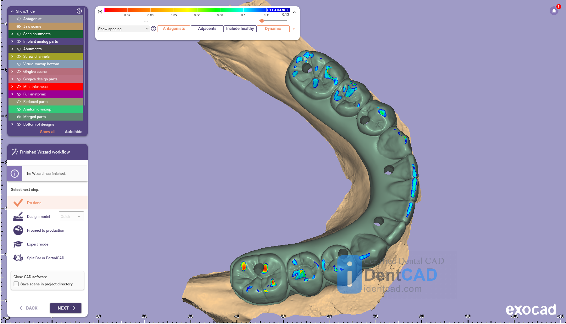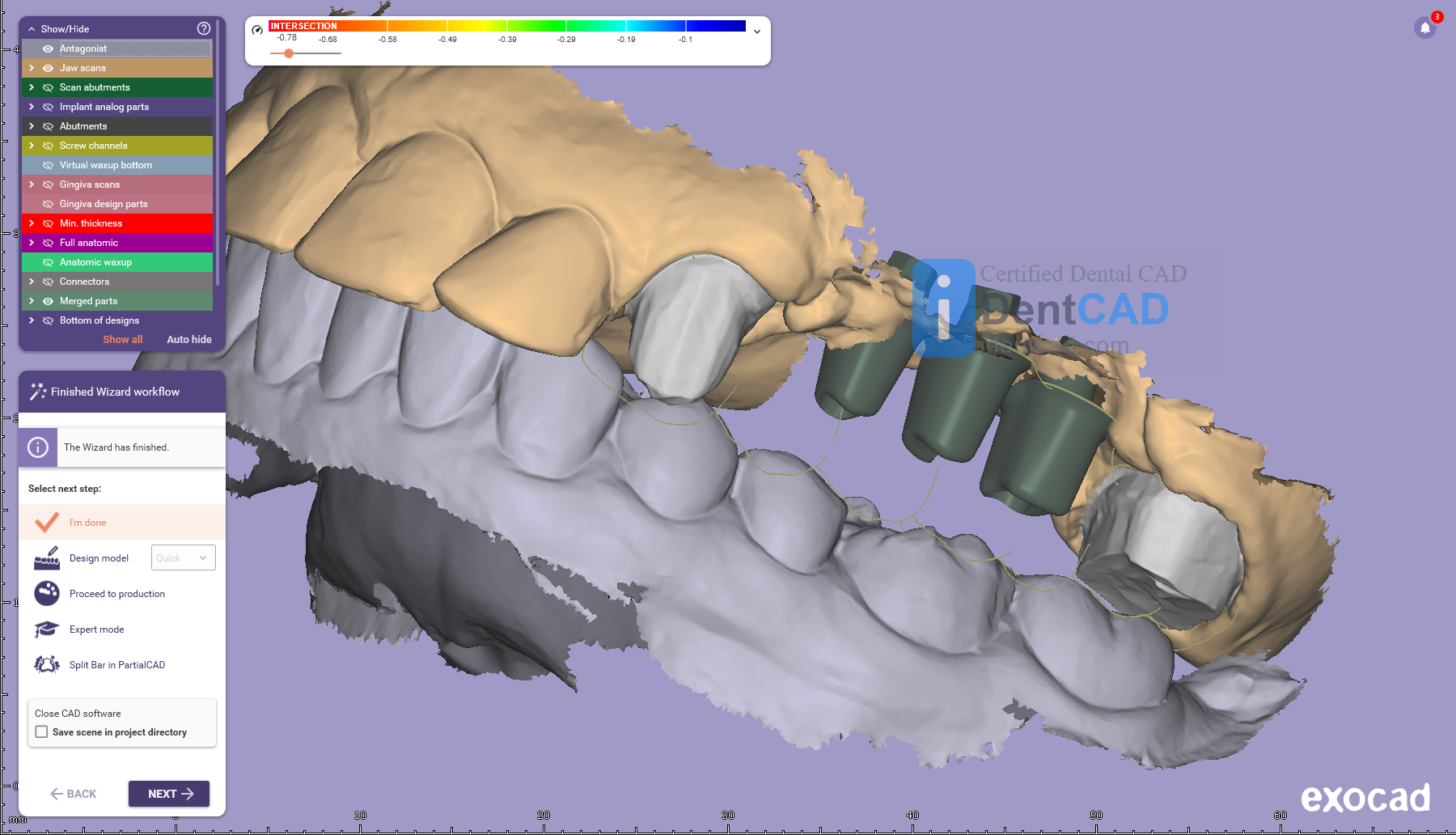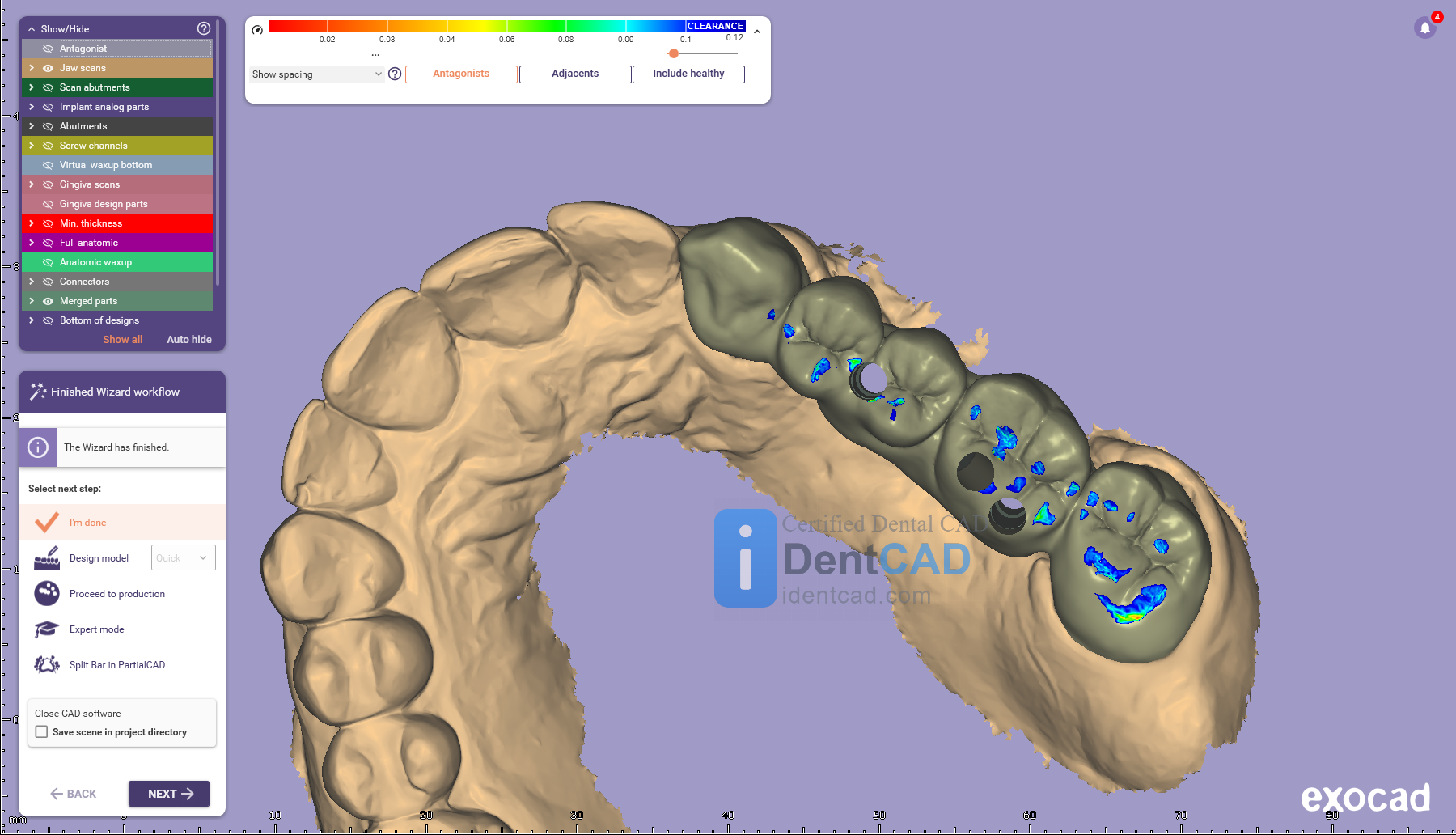 Our primary workflow is built on Exocad (DentalCAD) for restorative, implant, and smile design cases. We also use 3Shape for cross-verification and articulation checks.