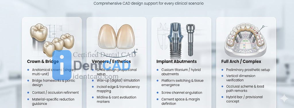 Professional CAD services for dentists and dental labs — crowns, veneers, implants, full-arch, delivered as STL ready for milling.